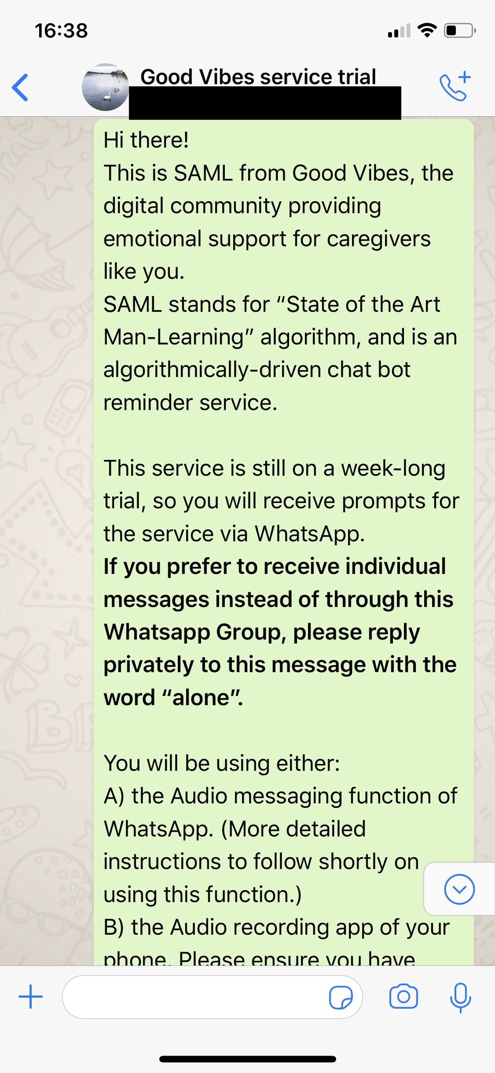 Evolution of Co-Worker Care Module This started with sharing of stories about residents, and was switched instead to vocal appreciation of colleagues due to constraints of privacy. To get more candid feedback, I dialled back fidelity while testing which aspect of solution should be digital vs. physical.The last trial involved WhatsApp audio messages, with me Wizard-of-Oz-ing as a machine-learning chat bot which sends prompts before, during and after the caregiver shifts.