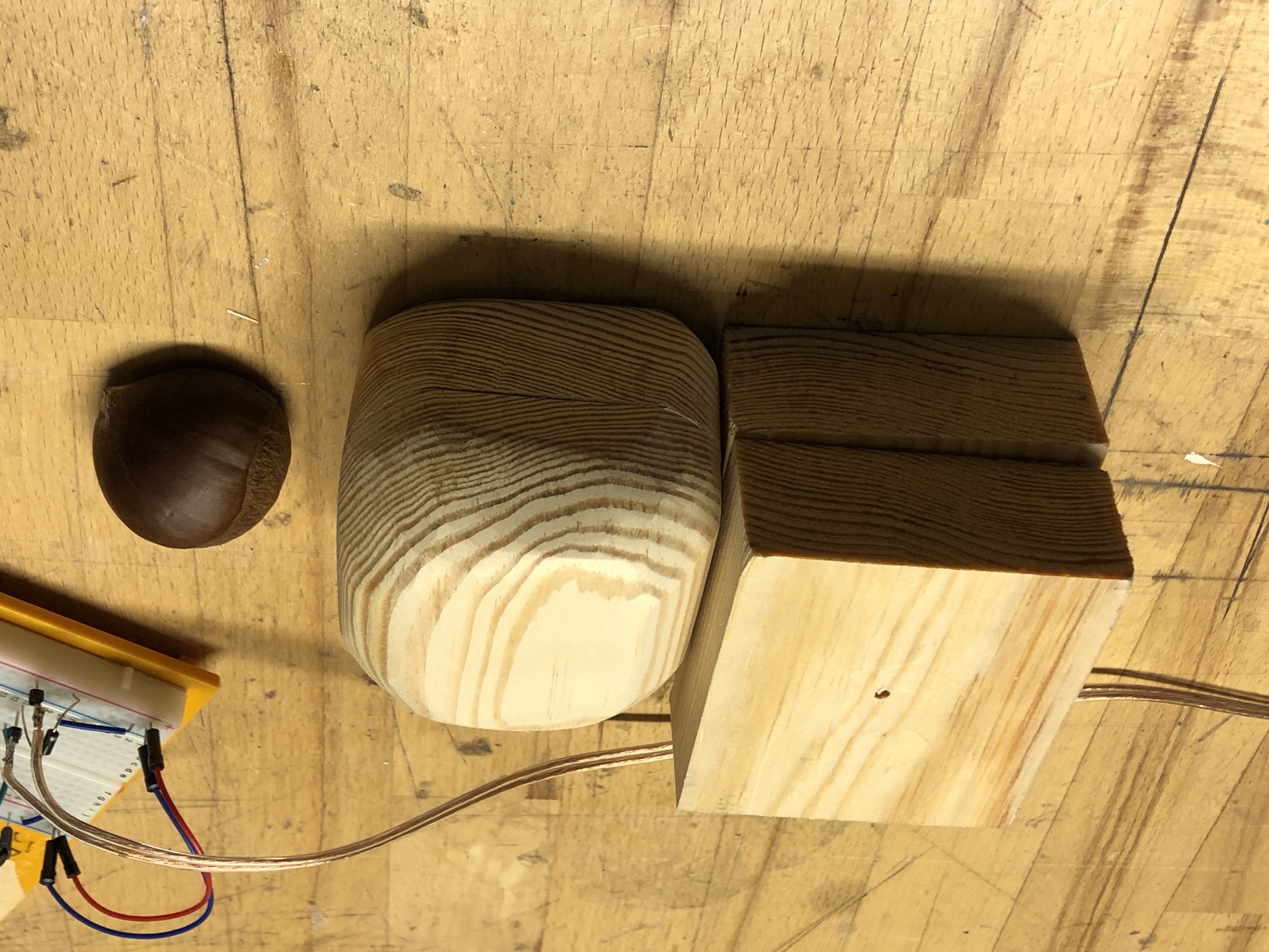 Unsanded box, sanded “chestnut” and actual chestnut, with Arduino circuit in the background