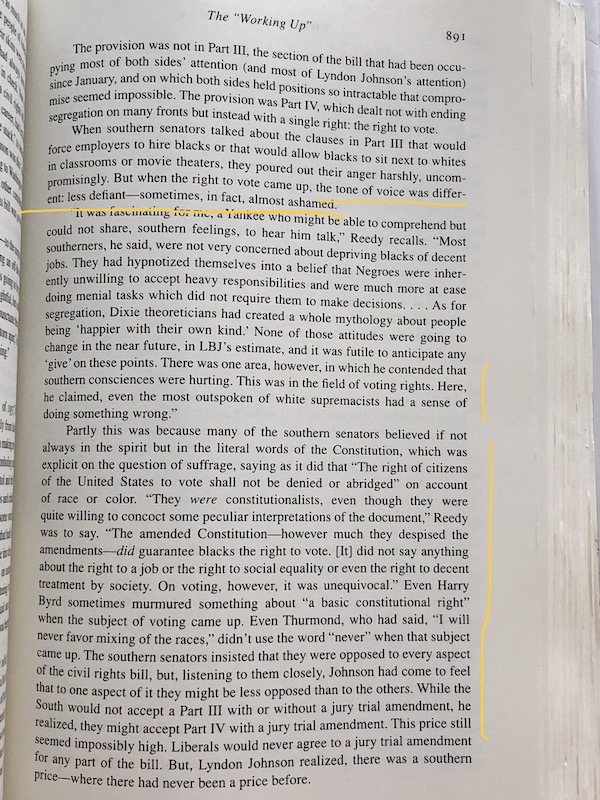 From the listening, Johnson was able to figure out what were the Southerners open to budge on, where they were open to change because they had a “sense of doing something wrong” in depriving black voters of their right to vote under the “literal words of the Constitution”.