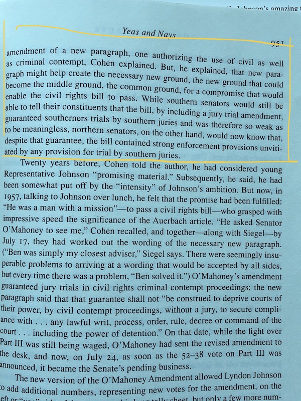 Johnson was stuck between the Southern faction and the Northern liberals. The Northern liberals wanted a civil rights act with teeth, which could actually be enforced. They did not want jury trials for civil rights violations in the south, because the South had a history of all-white juries voting in support of the existing racial status quo (i.e. whites got away scot free for lynching black folks).