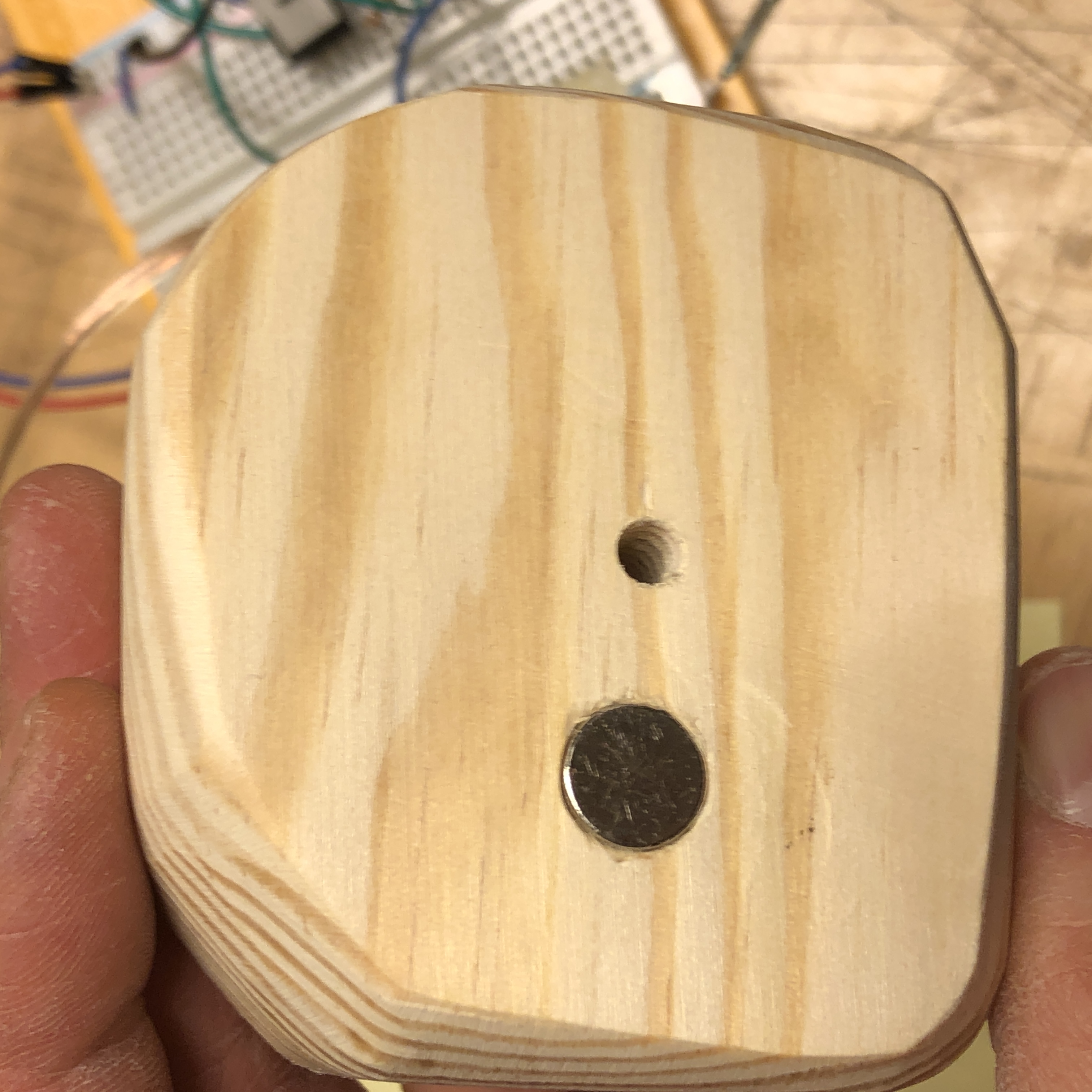 The insides of the final prototype. Between the masking tape on the left, is a reed switch (which is activated by the magnet at the bottom of the “chestnut”).