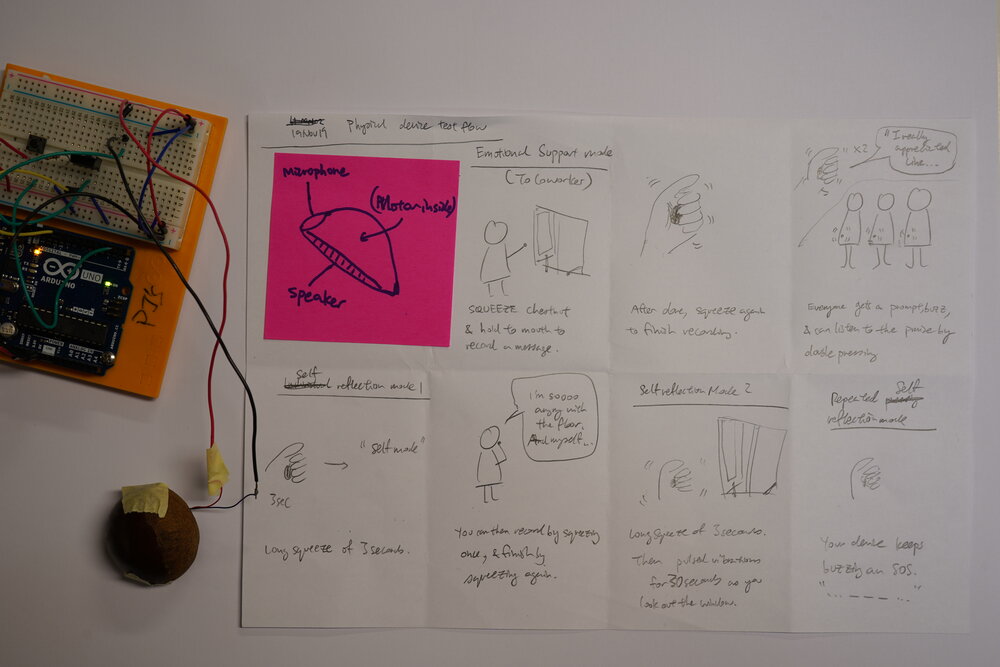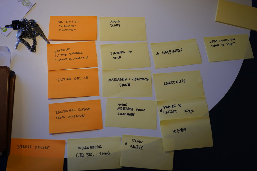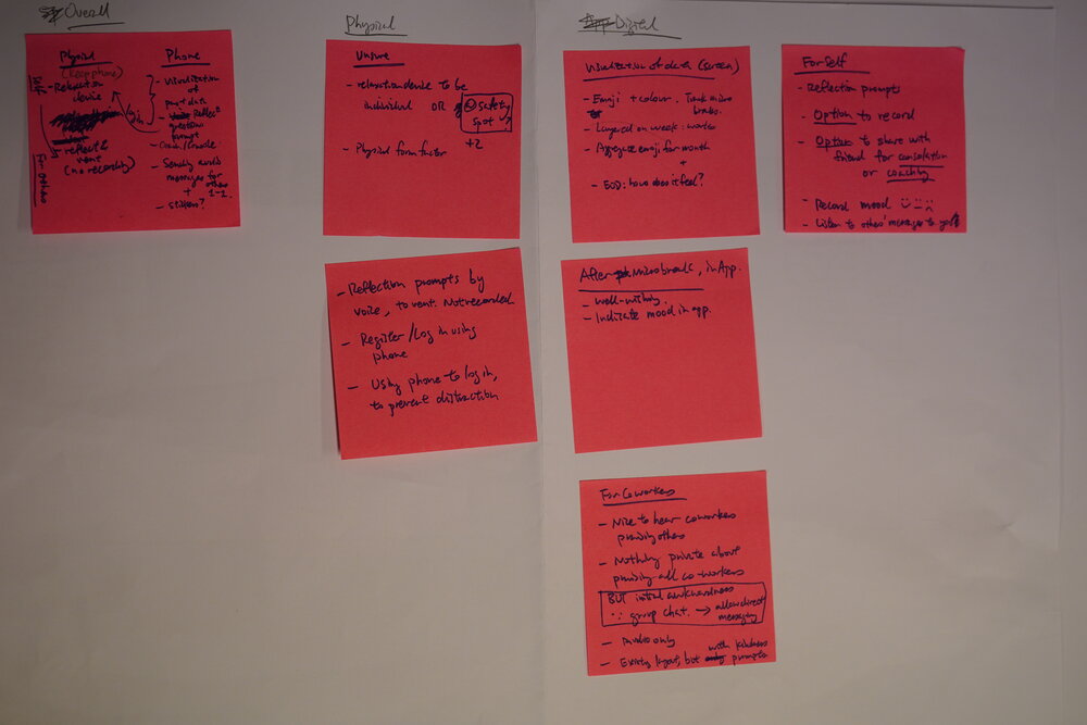 Consequently, I went back to using sorting cards. I also created a storyboard to test the different modules (co-worker care, self-care) using both digital and physical devices, and also used lo-fi screens (i.e. Post Its) and hi-fi screens to test and find out what needed to be physical vs. digital. Sorting Cards