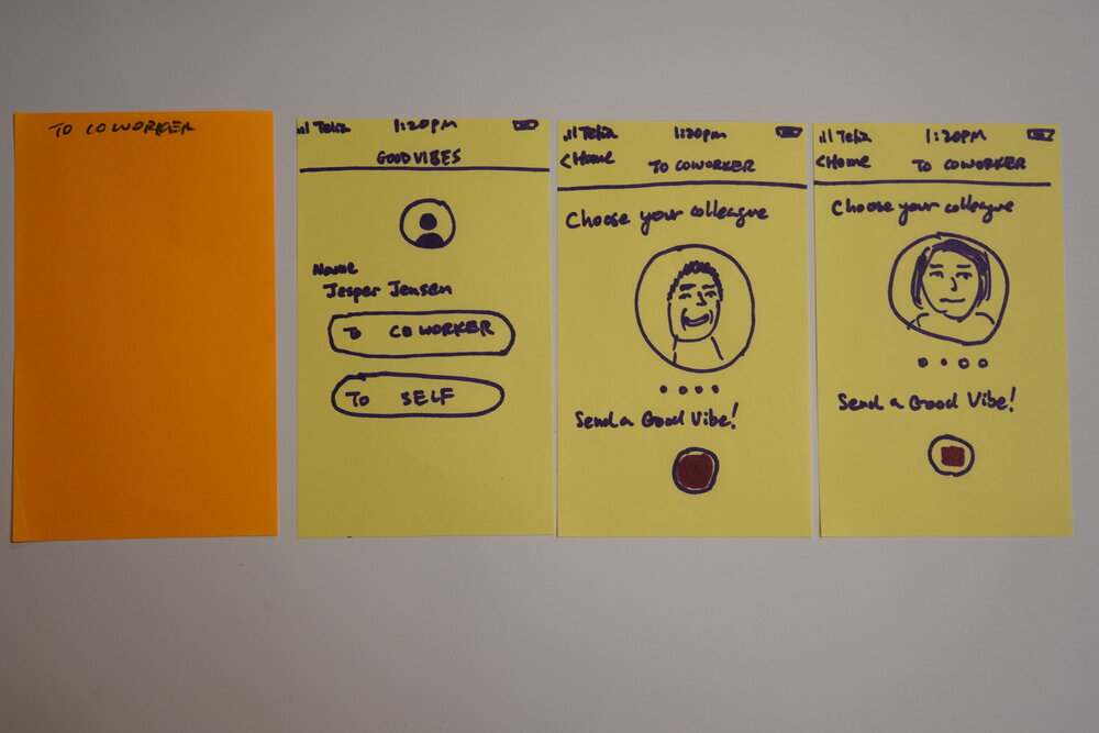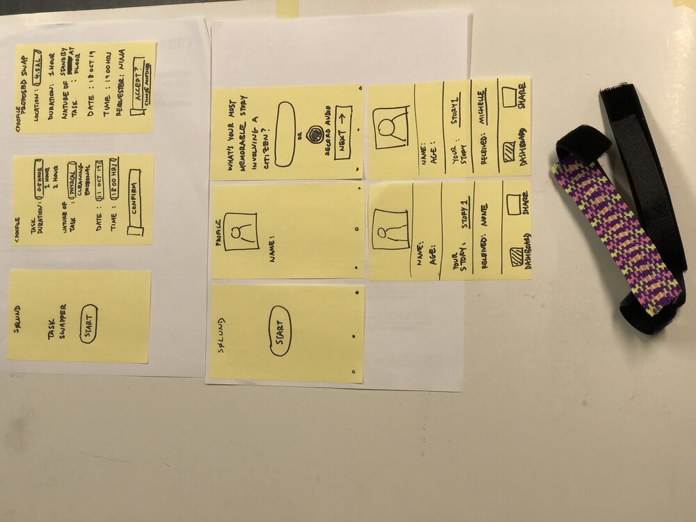 Lo-Fi Post-It “screens”, which were used to test the “app”, concurrent to the physical device test. Both were used to figure out what part of the solution should be digital vs. physical. C