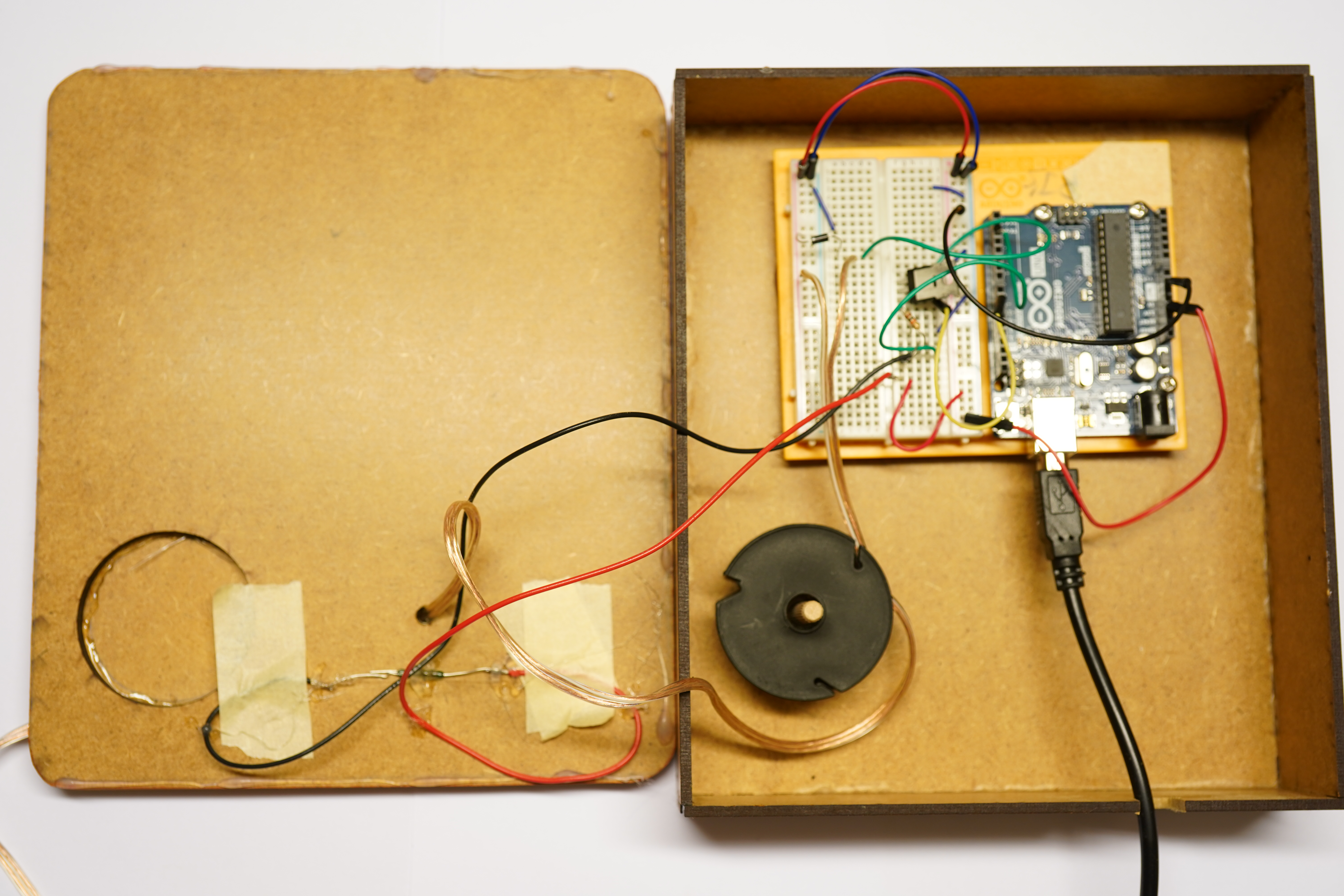 Just before the final assembly: the unsanded box, the “chestnut” (after two days of cured linseed oil varnish), with the vibration motor+padding above it, and finally the Arduino circuit
