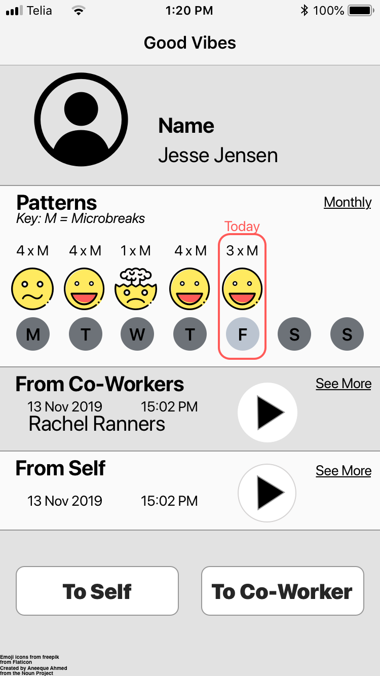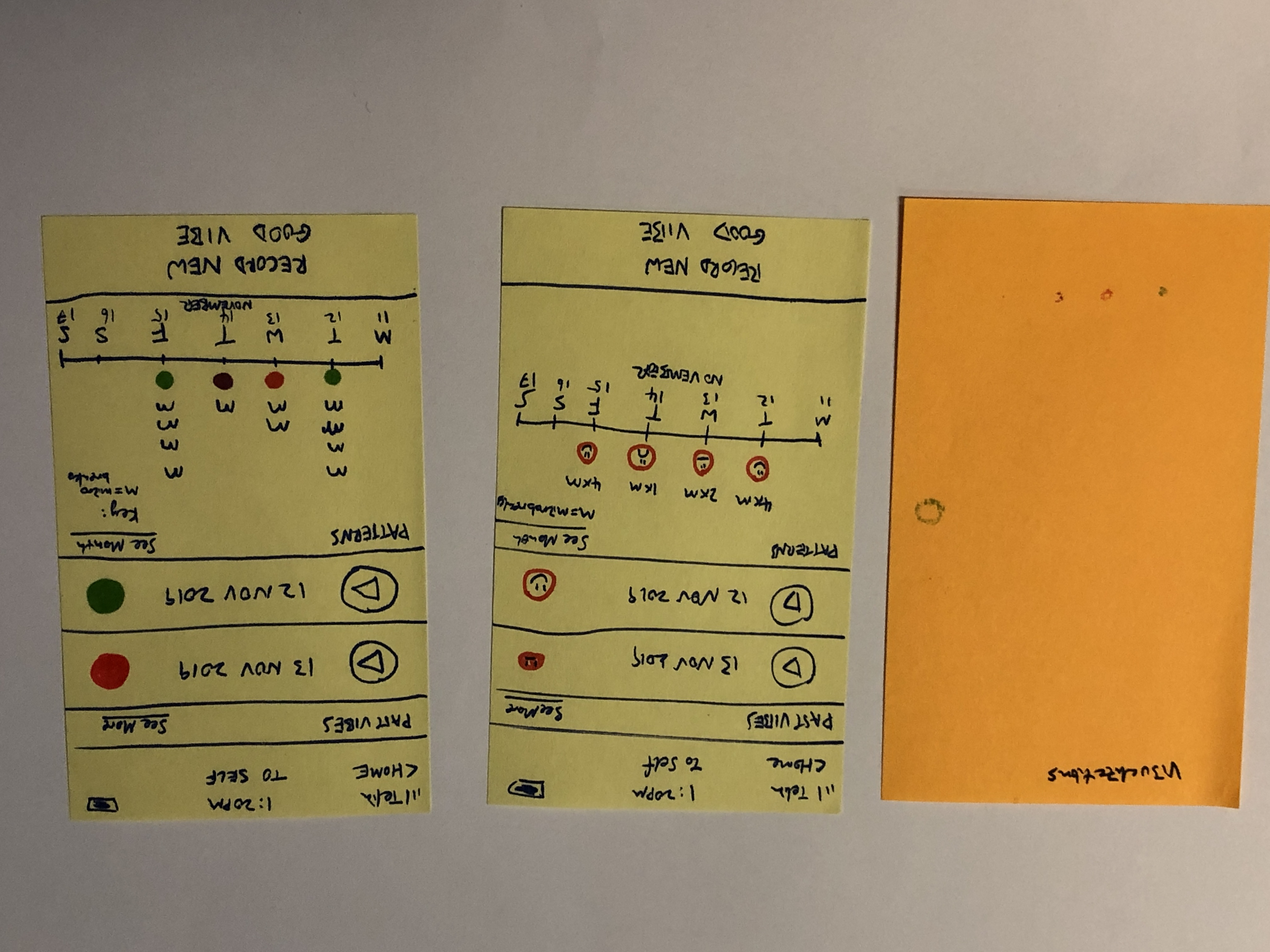 21 Nov 19. From the co-creation feedback, there was a need for mood-tracking and reflection. These Post-It screens were created as part of the test with caregiver F.