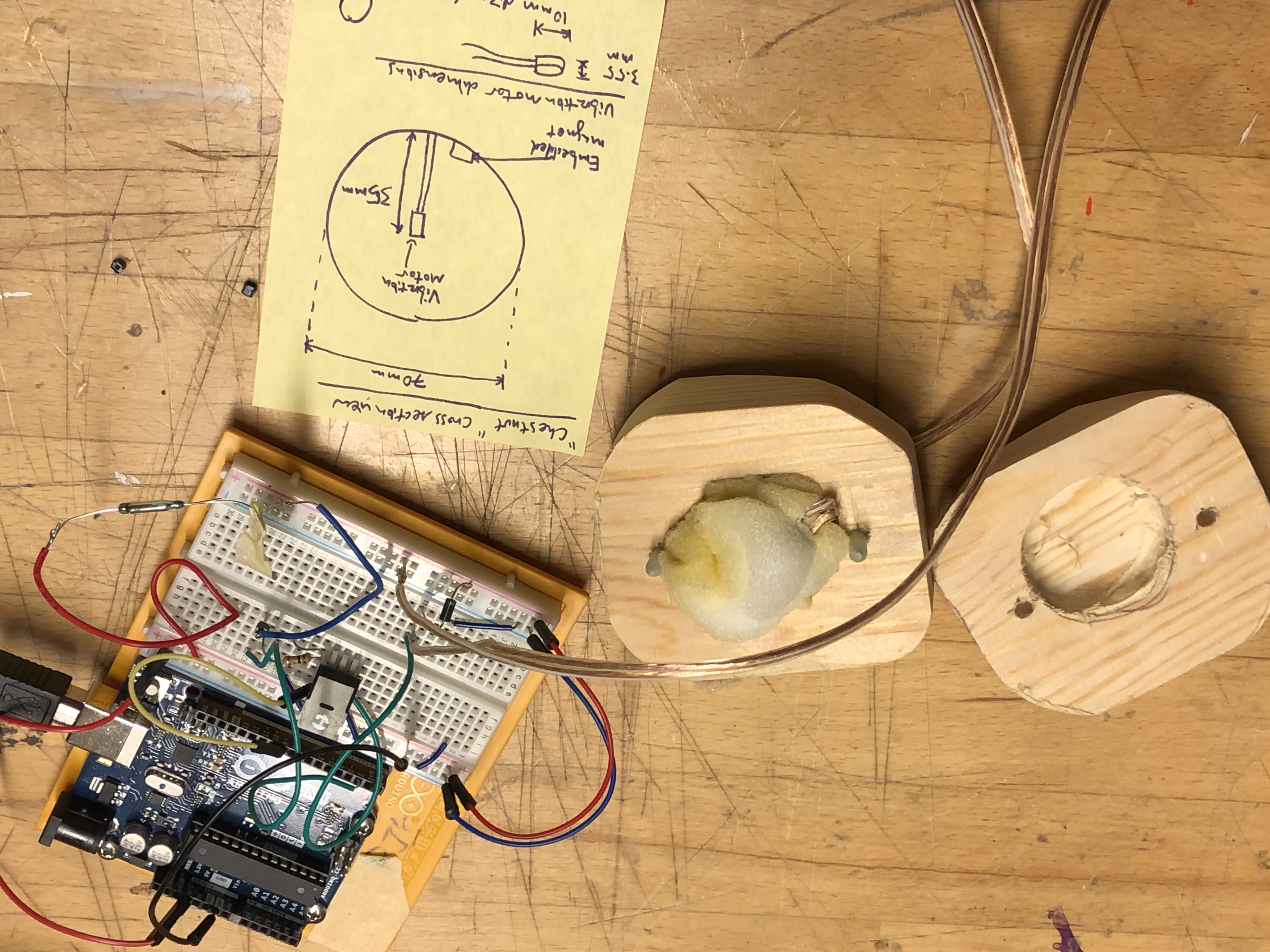 The “chestnut”, with the vibration motor and padding. On the righthand side is the Arduino circuit, with the “chestnut” construction plan in the Post It below.