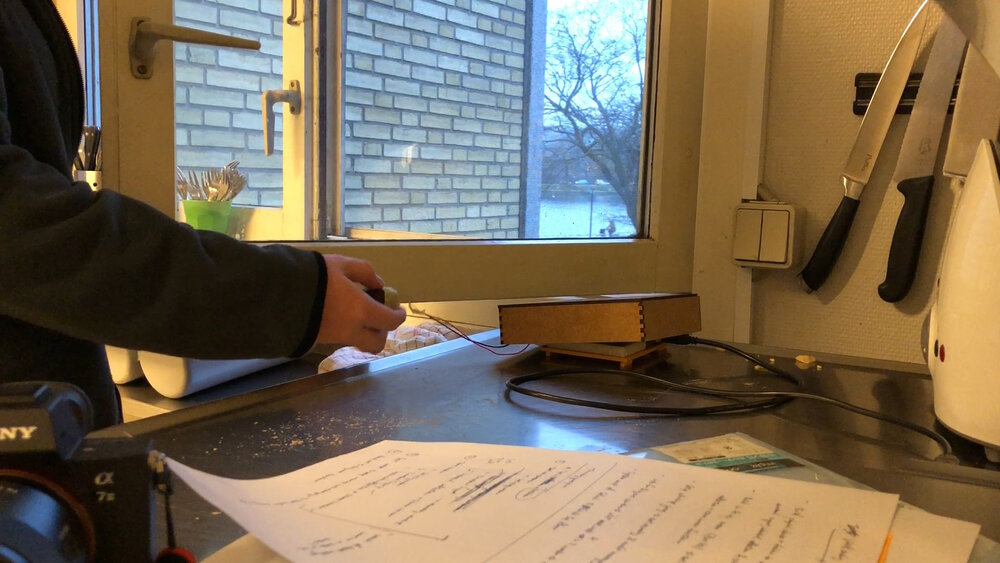 21-27 Nov 19. This was my most widely-used test setup: an Arduino, an old MDF box from a previous project, a real chestnut, with a vibration motor taped to it. This was used to test the physical flows, but also the effect of the haptics on the caregivers (as shown in the validation video).