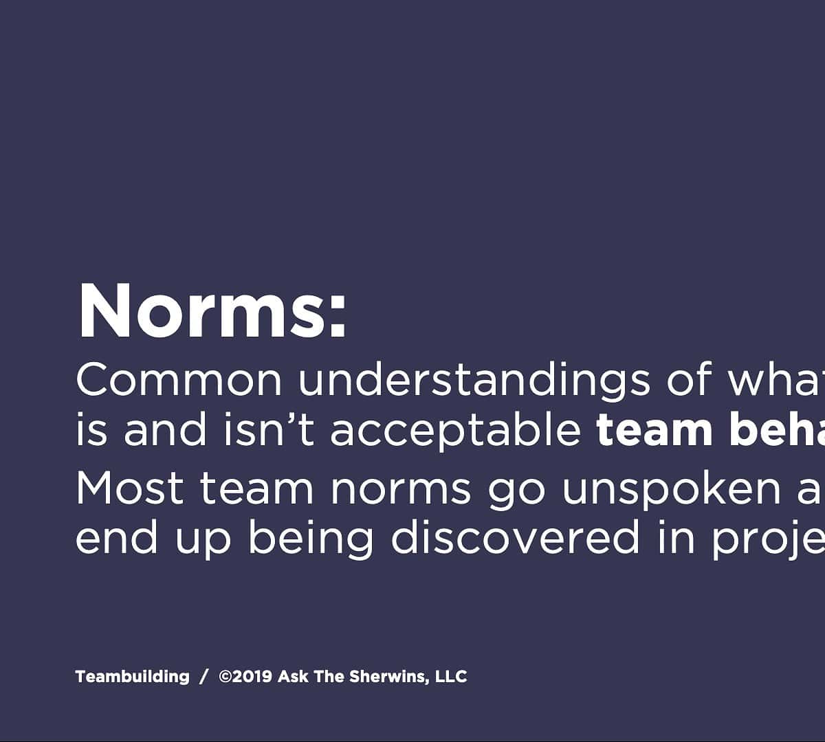 But the most critical technique and ritual was norming a teamâs behaviour. Without that, you just have a collection of individuals; but with norms, you provide an API for individuals to interact with each other, forming a team.