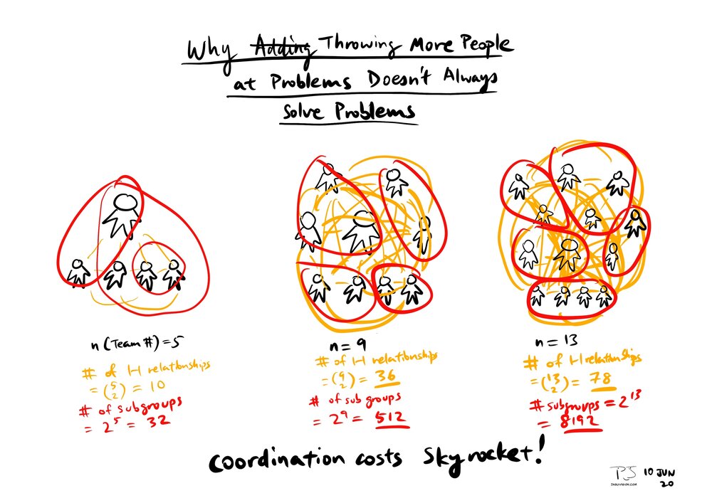 in this day and age, i think it’s a problem having too many people with the incorrect skills to address problems. because when you throw people at the problem, what ends up taking up their time is coordination: they spend a fair bit of time trying to figure out what to do collectively, and that means alot of time is spent talking to each other.