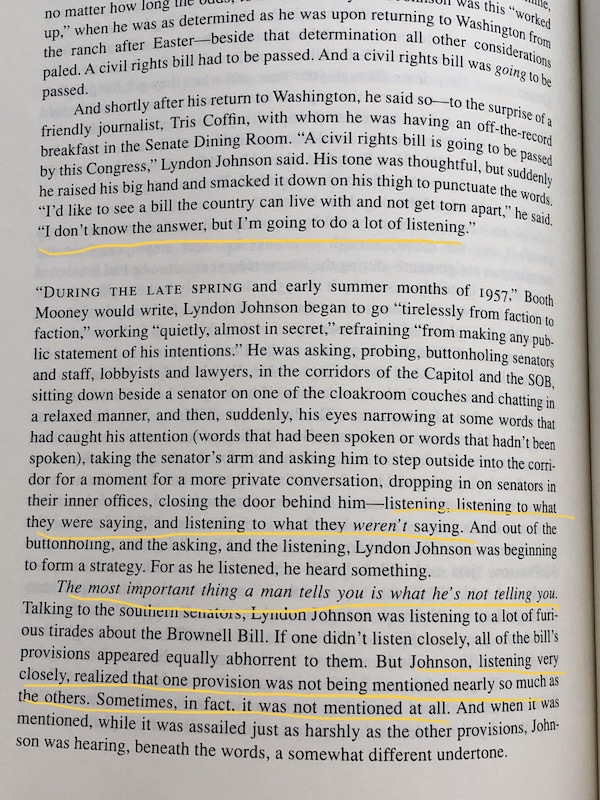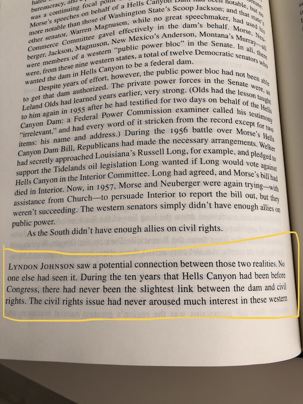 Similarly, it was acts of listening which allowed Johnson to figure out how to get the support he needed. To pass the Civil Rights act, he needed a bloc of voters to support the South’s amendments. In order to do so, he quickly realised that he could create a transaction between the Southern bloc and the western liberal Democrats, with the South supporting the western Democrats on Hells Canyon (which was their key promise to their constituents) in exchange for the western Democrats’ support