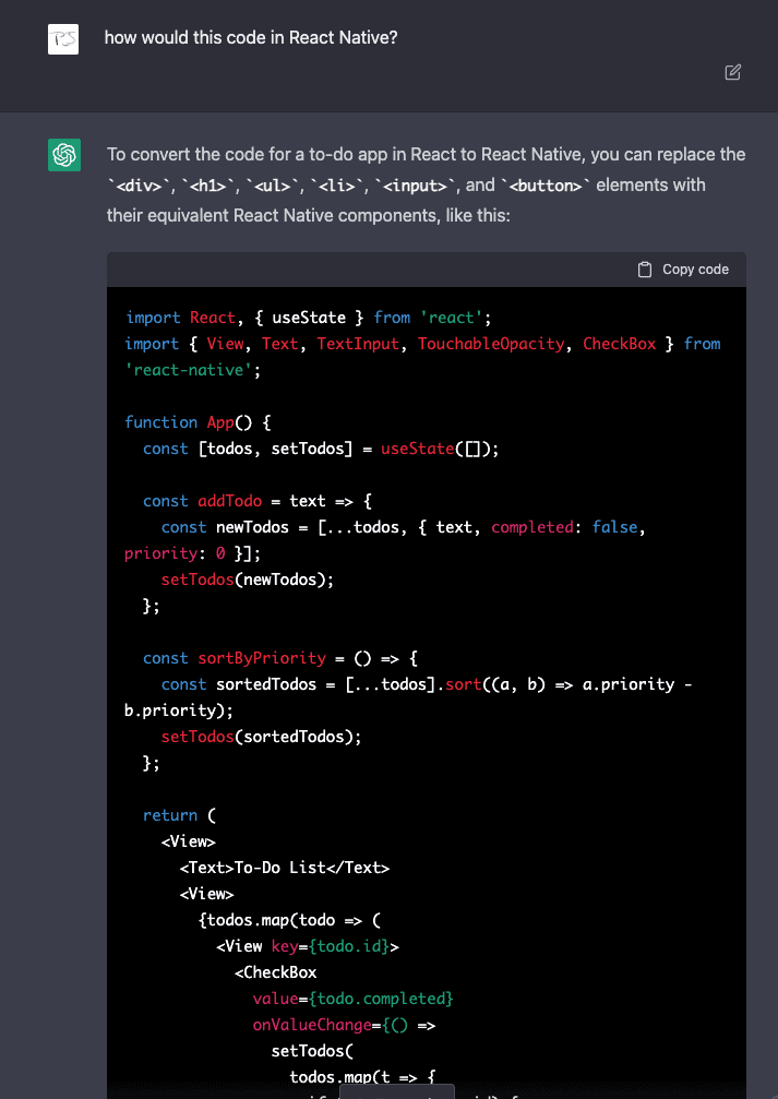 It was even able to convert React to React Native, while telling you what are the main differences: