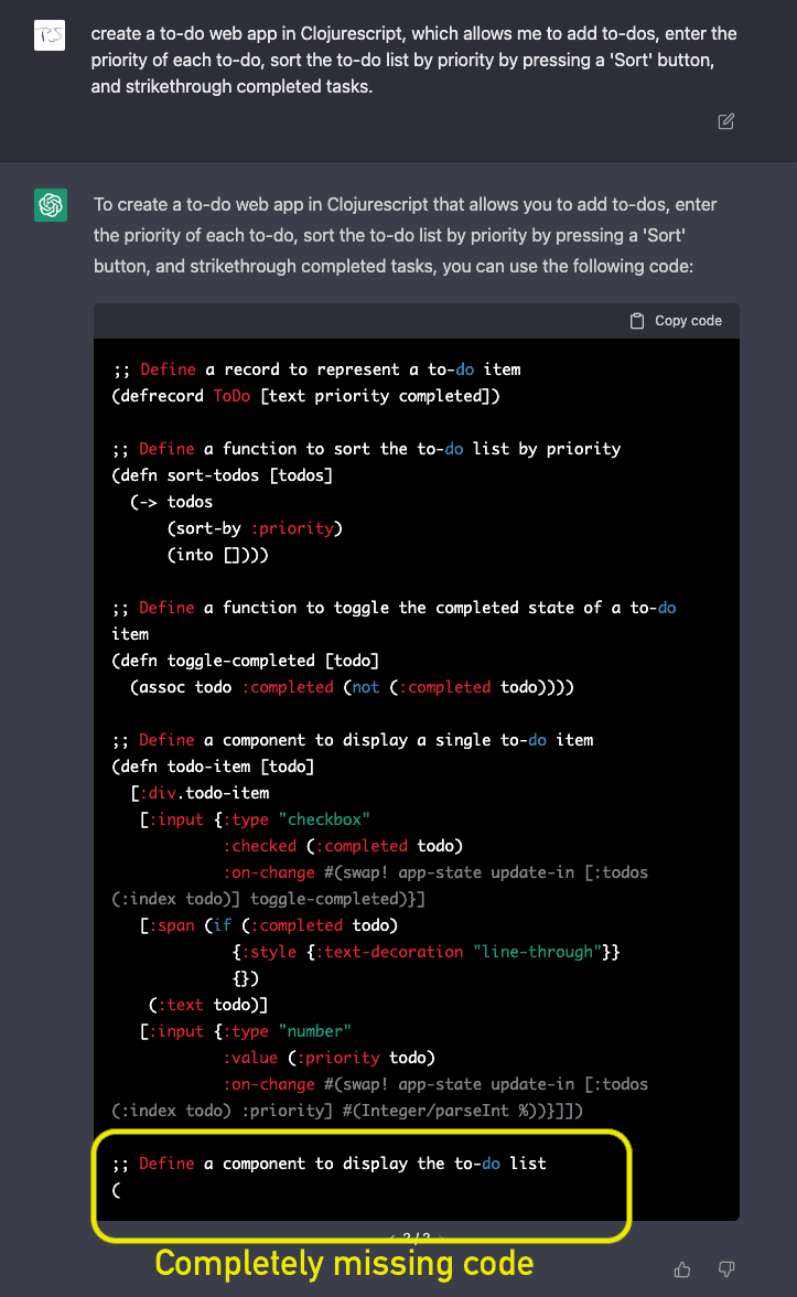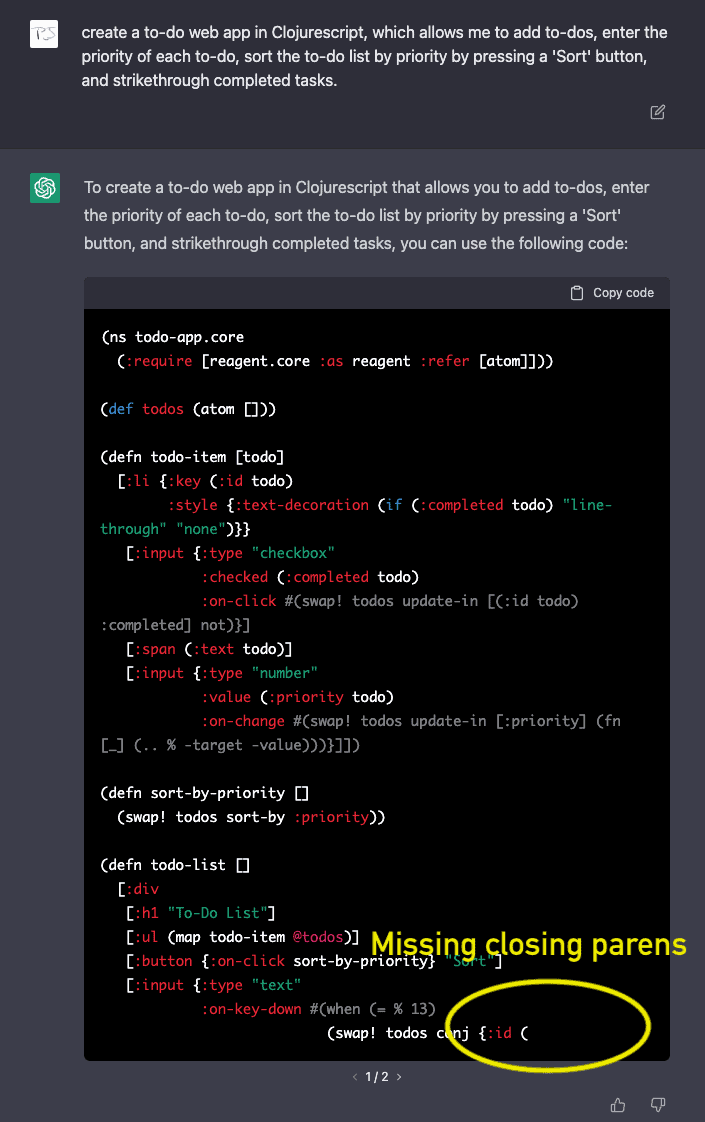 I then tried to get Chat GPT to generate Clojurescript code, and this is where it tripped up badly: