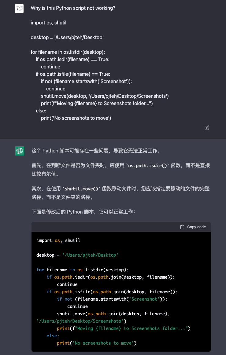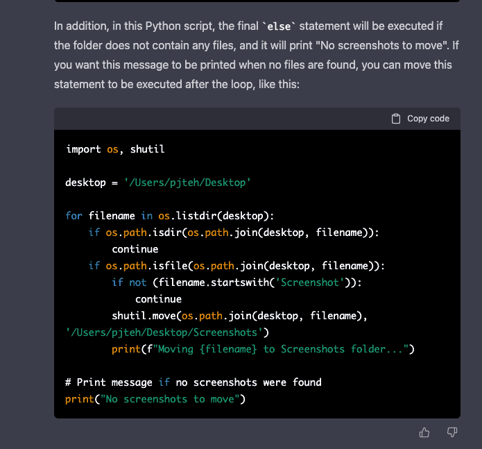 Chat GPT also helped me to troubleshoot a Python script I had written up to organize my screenshots on my desktop. I had written this script a few days ago, and while it works, it also had a strange effect of shifting the folder containing the script into the destination Screenshots folder (which I didn’t want). I didn’t know why this was the case.