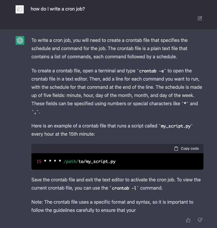 When I asked a question about cron jobs, Chat GPT gave a great answer on how to use crontab, and the syntax of editing a crontab file in the Terminal: