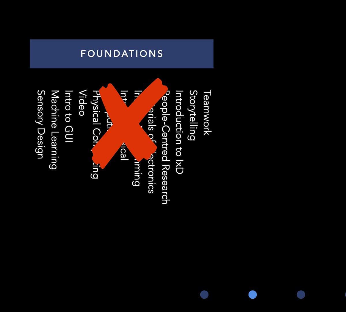 Thereâs a logic to the sequencing, which incrementally builds on previous foundations. For example, Introduction to Programming (where we learned Processing, a Java-based language) comes before Physical Computing. Why? Because you need to learn how to troubleshoot code (in computing projects), before you learn to troubleshoot code, mechanics and electronics (in physical computing projects).