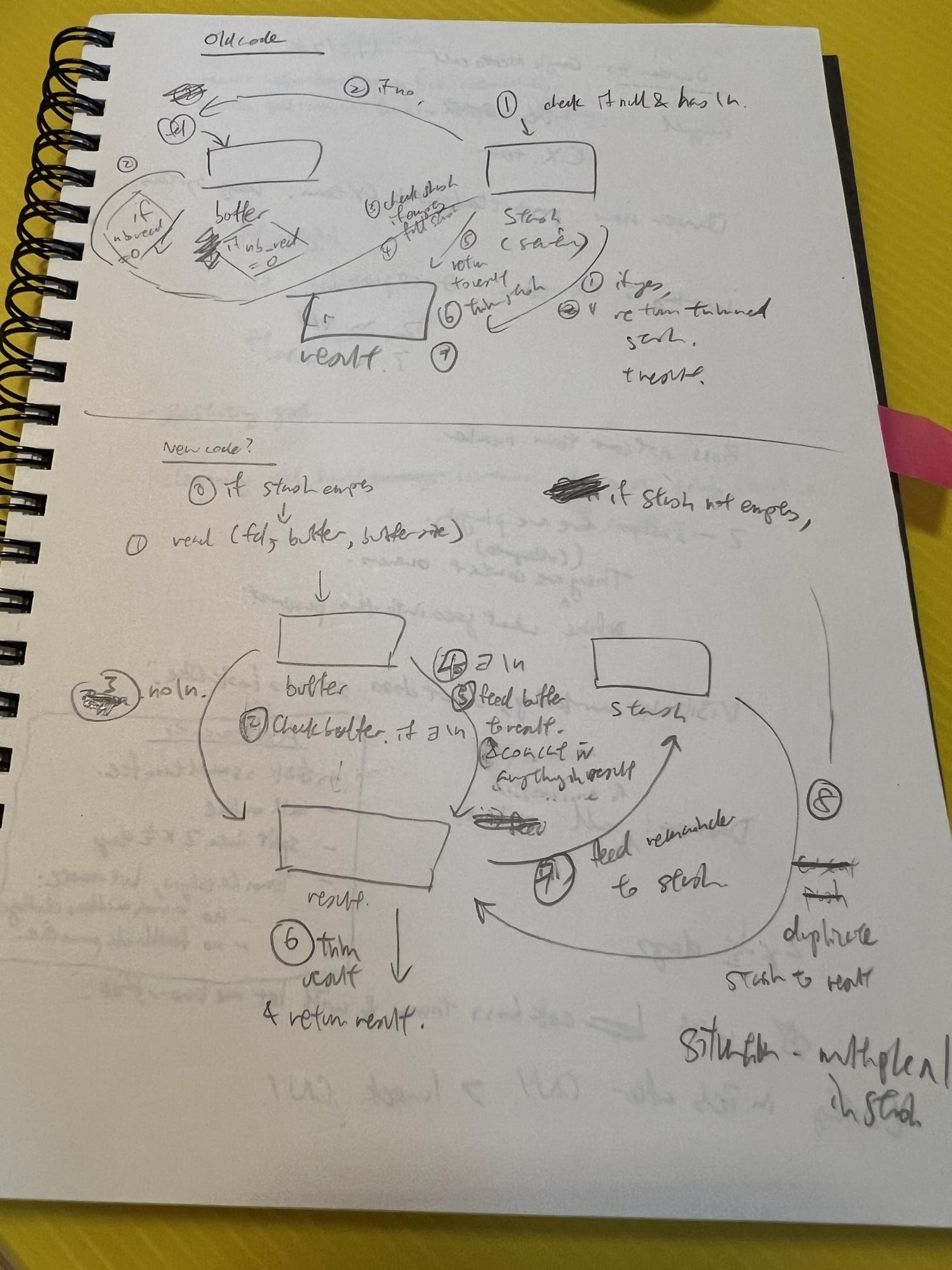 2-4 Jan 24: At this point, my approach was to try and iterate off the working sample code for reading from an fd, rather than trying to architect everything: the build-something-simple-and-build-again-after-it-works approach had worked for the previous project, ft_printf (which required us to duplicate the printf function in C). I was able to iterate until I could pass an unedited string from the buffer (which was read from fd), into the stash, and then to the result variable, without editing the string. When that worked, I added functions to check & trim the string, but it got very confusing… but I was able to return a single line.
