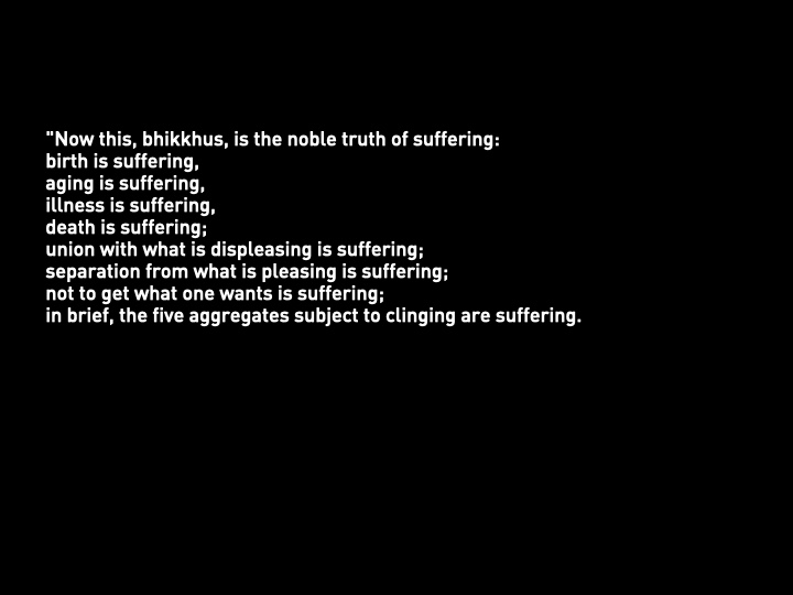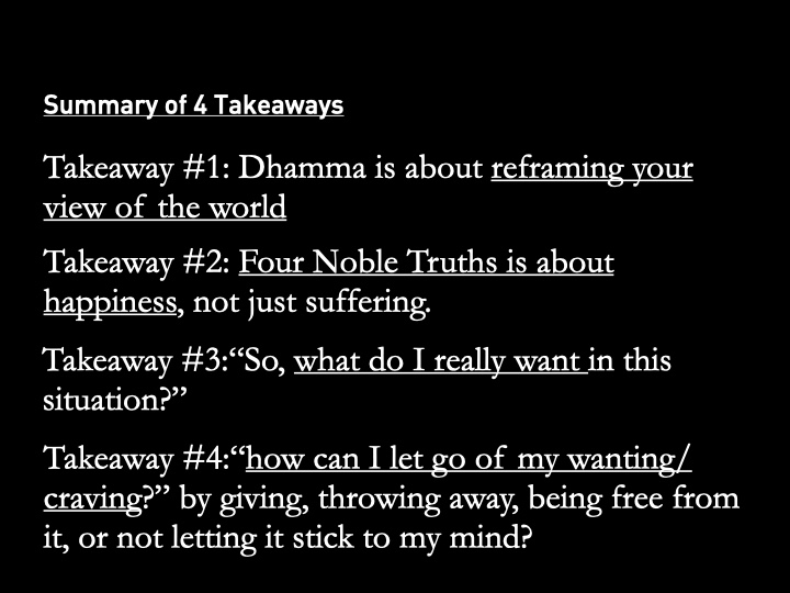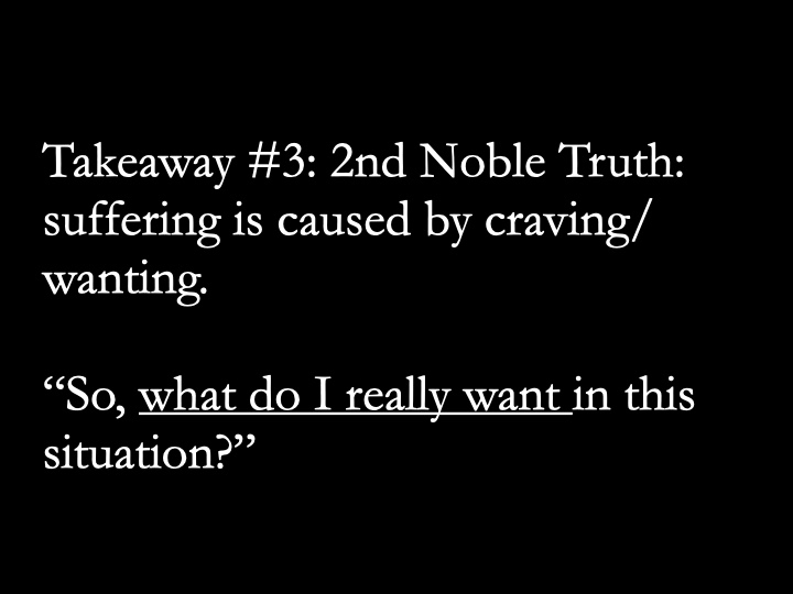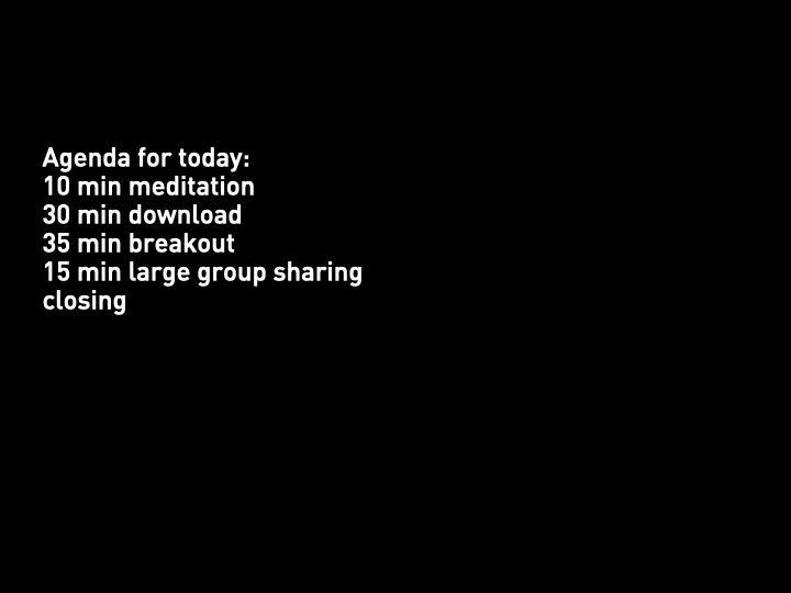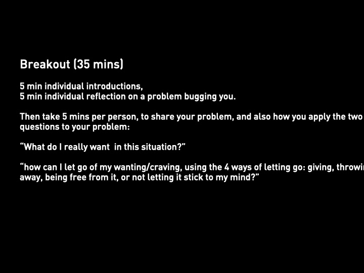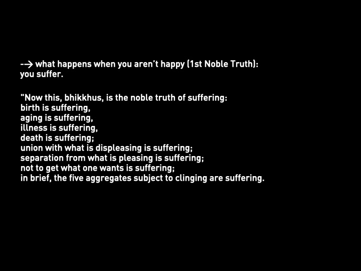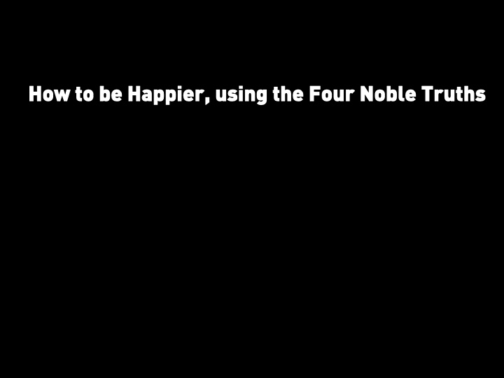 Today, we are going to cover a few topics, and this is the agenda. We will focus today primarily on the Four Noble Truths, and use that as a framework to be happy-er. :) We will first have a download of what the Buddha actually said about the Four Noble Truths, and then use that to unpack his meaning, followed by breakout sessions to discuss how to apply this in our daily lives. # |