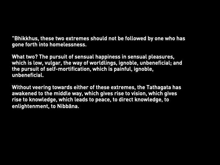 We will start first with the Buddha’s teaching at the Deer Park, in Sarnath, Isipatana, outside Baranasi (present day Varanasi). There, according to tradition, the Buddha taught the five first disciples the Four Noble Truths, in the Dhammacakkapavattanasutta: the turning of the Wheel of Dhamma. But I am going to change the order a little bit, so that it is easier to understand. # |