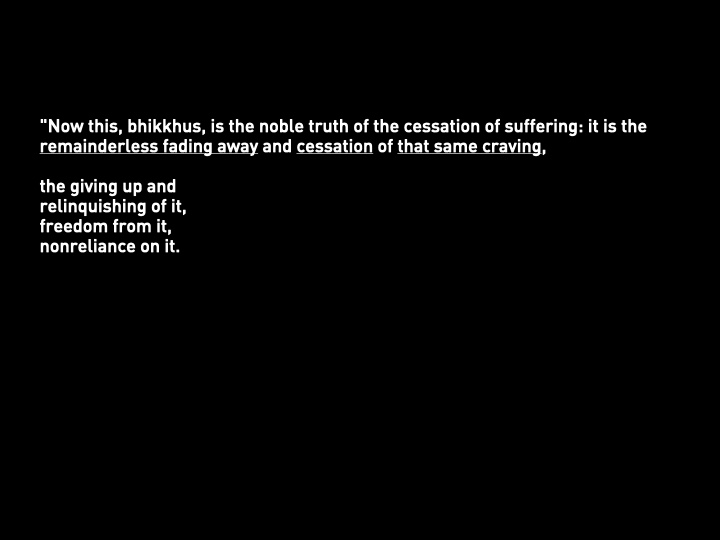 ‘it is the remainderless fading away and cessation of that same craving, the giving up and relinquishing of it, freedom from it, nonreliance on it.’ The Four ways of letting go: giving (without expectation), throwing away, being free from it, and not letting it stick to your mind. # |
